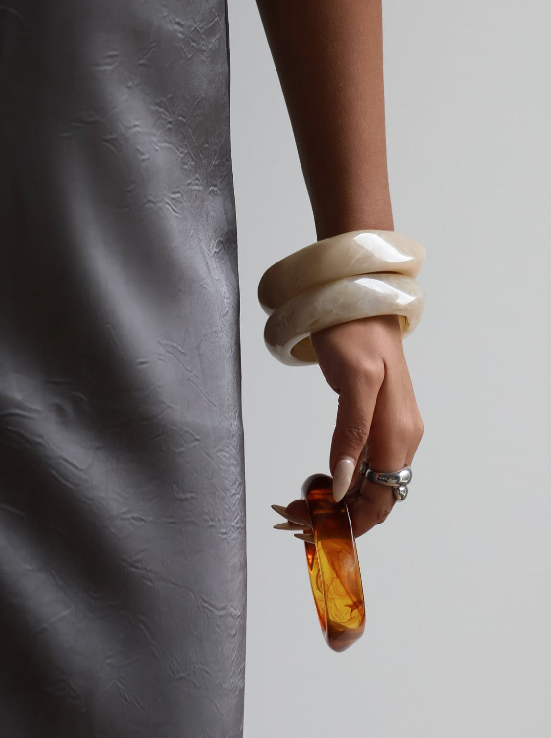 Wrap your wrist in style with the Clara Bangle in a beautiful beige tone with a milky white swirl. Crafted to elevate your outfit making a stylish statement.